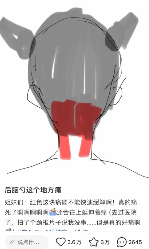 后脑勺疼,很可能是你的枕下肌群在抱怨,它太累了,太紧张了,忍不住要压迫神经,它过劳还导致经常向大脑发送错误的危险讯号。