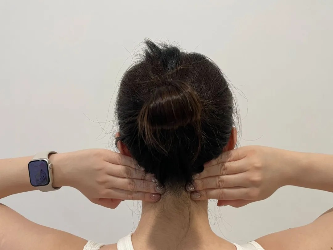 双手手指并拢放在发际线偏下一点的位置,想象脖子后侧的软组织像柔软好塑型的橡皮泥,双手向颈部中线移动时上段颈椎缓缓抬头,双手回到初始位置时微微低头,幅度不用太大(图中为了展示清楚,幅度会偏大一些)。