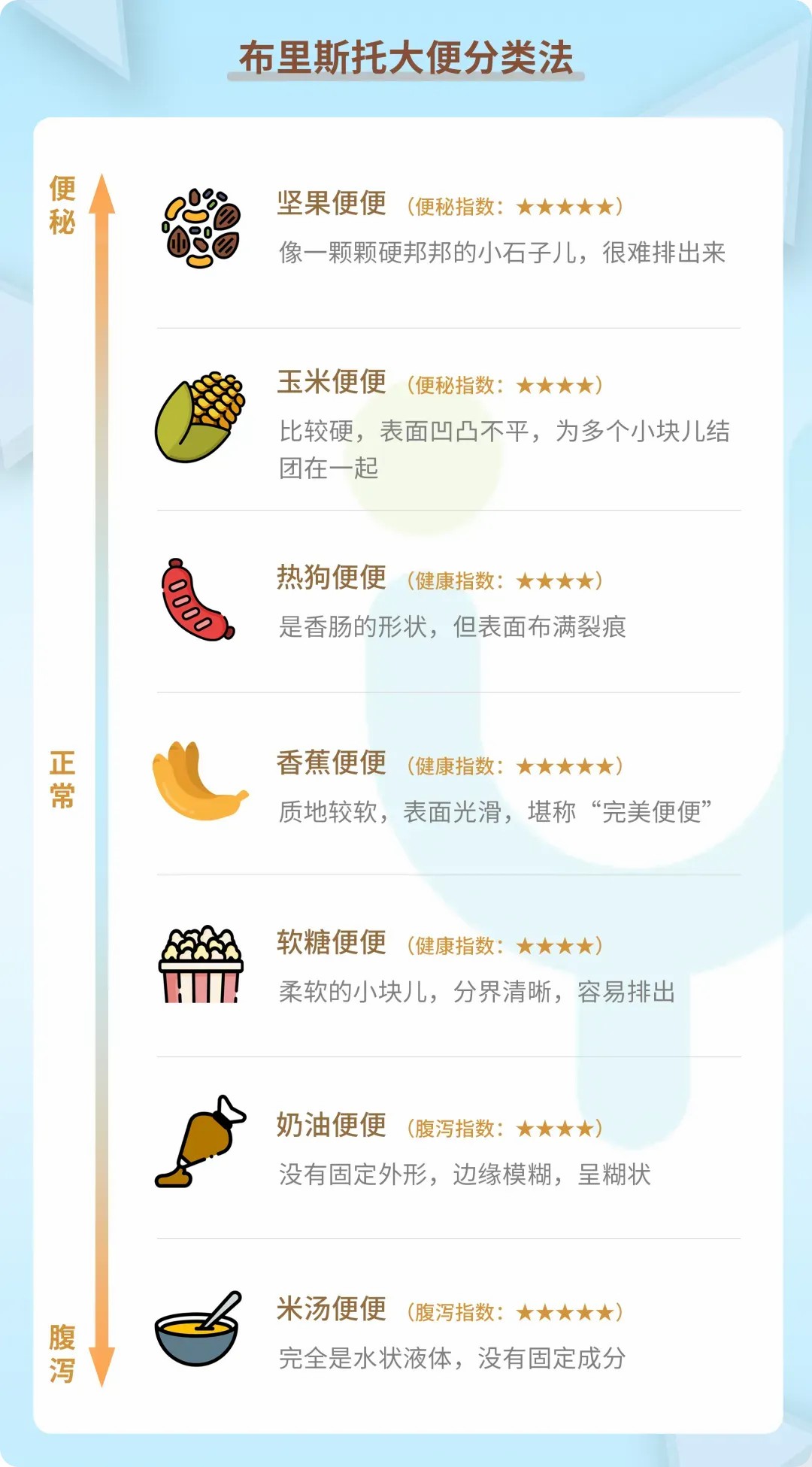 健康排便的标准包括[5]:排便规律、不费力、无腹痛,粪便外形接近布里斯托大便分类的 3~4 型(即下图的软条状)。