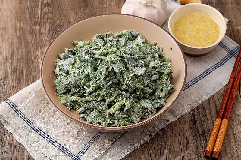 裹粉抓匀:将红薯叶放入一个大碗中,撒上适量的面粉或玉米粉,用手轻轻抓匀,让每一片叶子都均匀地裹上一层薄薄的干粉。这一步可以锁住水分,使蒸出的菜叶不粘连、口感干爽。