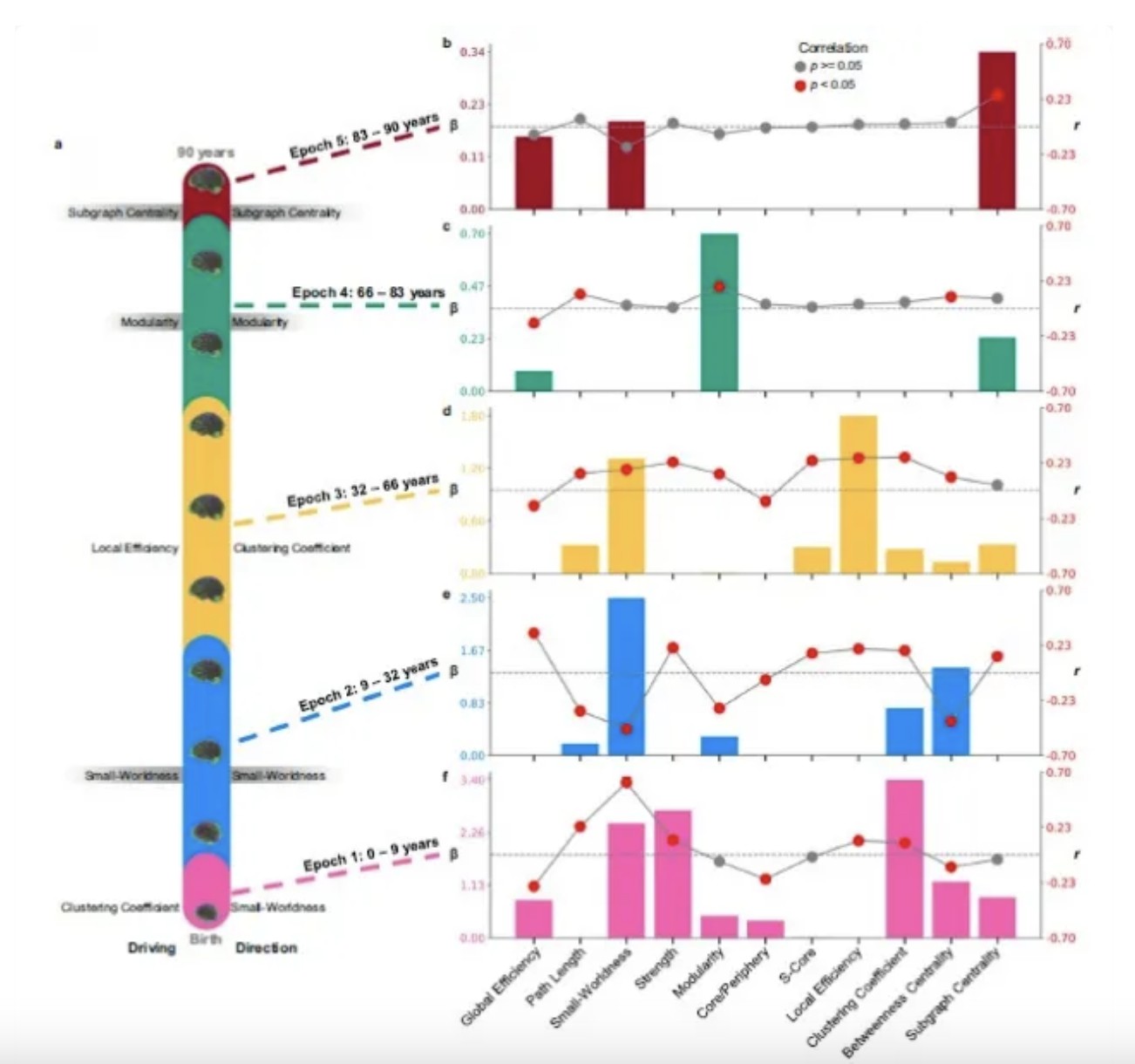 下图展示核心研究发现,纵轴为年龄与阶段,横轴为不同测量参数。整体脑整合水平、各子系统的模块化程度、子系统在全局与局部层面的互联性、“智能”聚类对处理速度与一致性的影响(“小世界结构”),以及各时期主要脑区作为关键枢纽的功能。