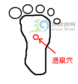 涌泉穴位于足掌心,具体位于足底中线前、中三分之一交点处,即足趾屈时,足底前凹陷处。每晚临睡前用热水洗脚,以及用手指按压该穴,或放一条小圆木棍,赤脚踏上反复滚动等,都可刺激该穴,有助于性功能。