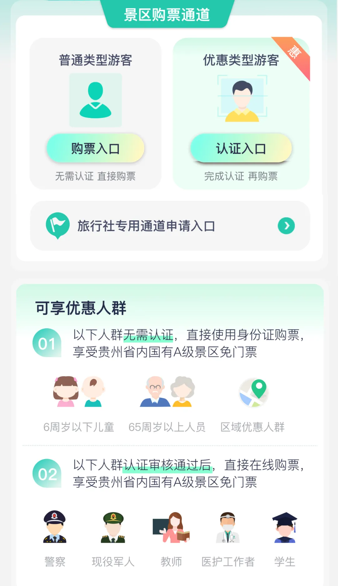 2.人民警察、现役军人、人民教师、医护工作者凭有效身份证明、工作证件和资格证件享受贵州全省国有A级旅游景区门票免费优惠(不含特许经营项目)。