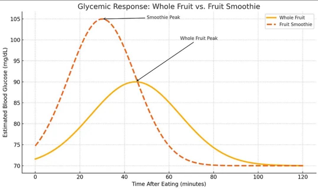 比较了吃整只水果与喝水果奶昔后血糖随时间变化的反应。奶昔的曲线(Smoothie)上升更快且峰值更高,而完整水果的曲线(Whole fruit)上升更平缓且峰值更低。图中有箭头分别指向两个峰值。