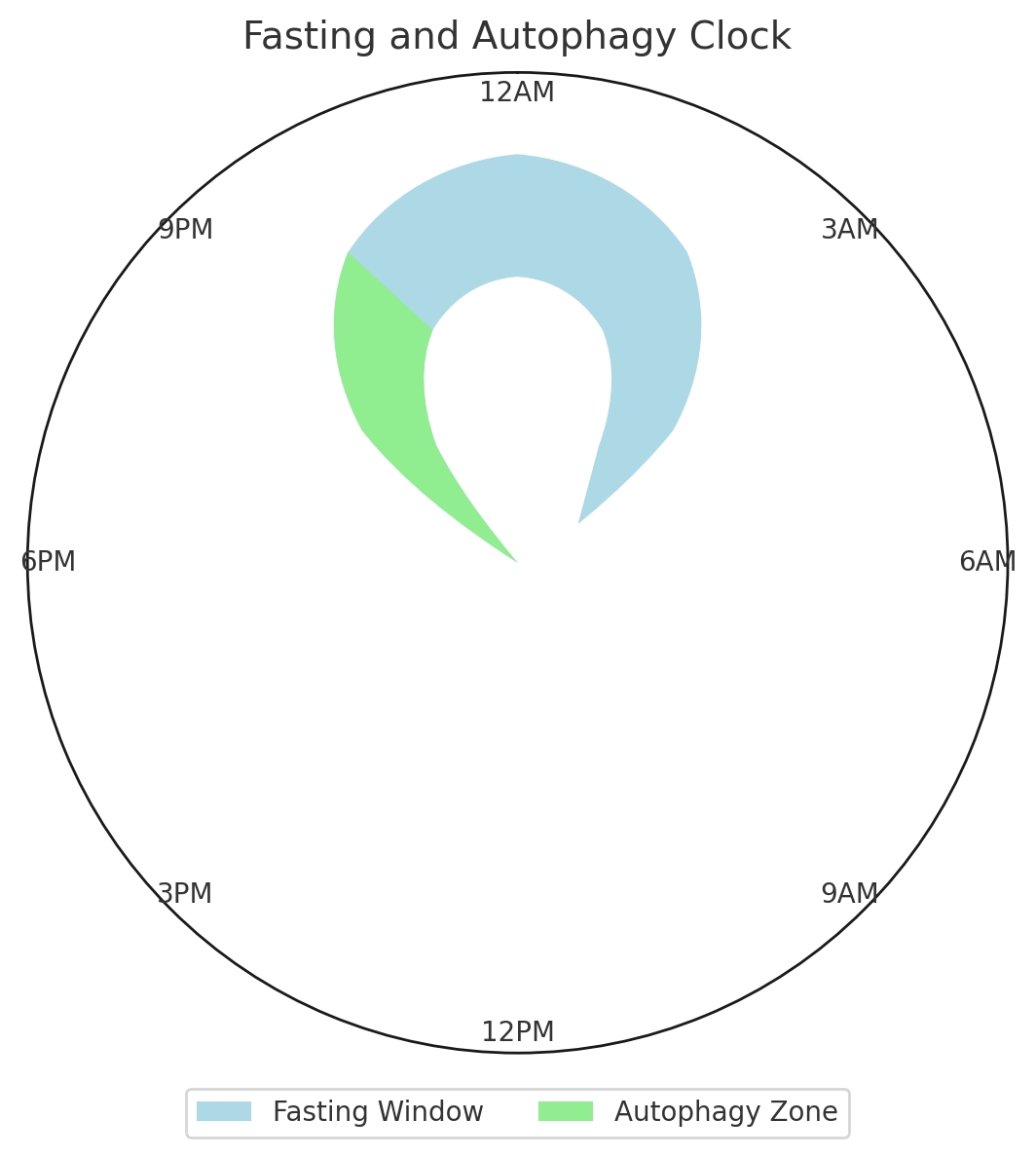 从晚上8点到第二天中午12点的蓝色禁食窗口,以及从早上8点到中午12点的绿色“细胞自噬”区域。该图说明了细胞自噬通常在禁食12小时后开始。