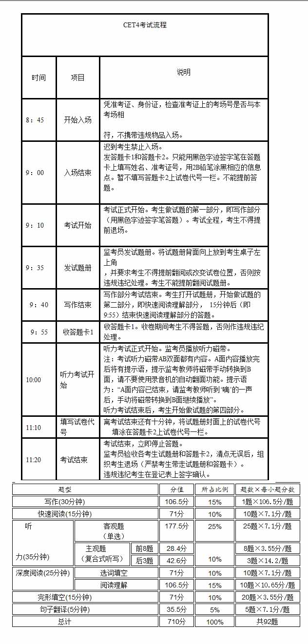 2014年大学英语四级考试流程及各题型分值